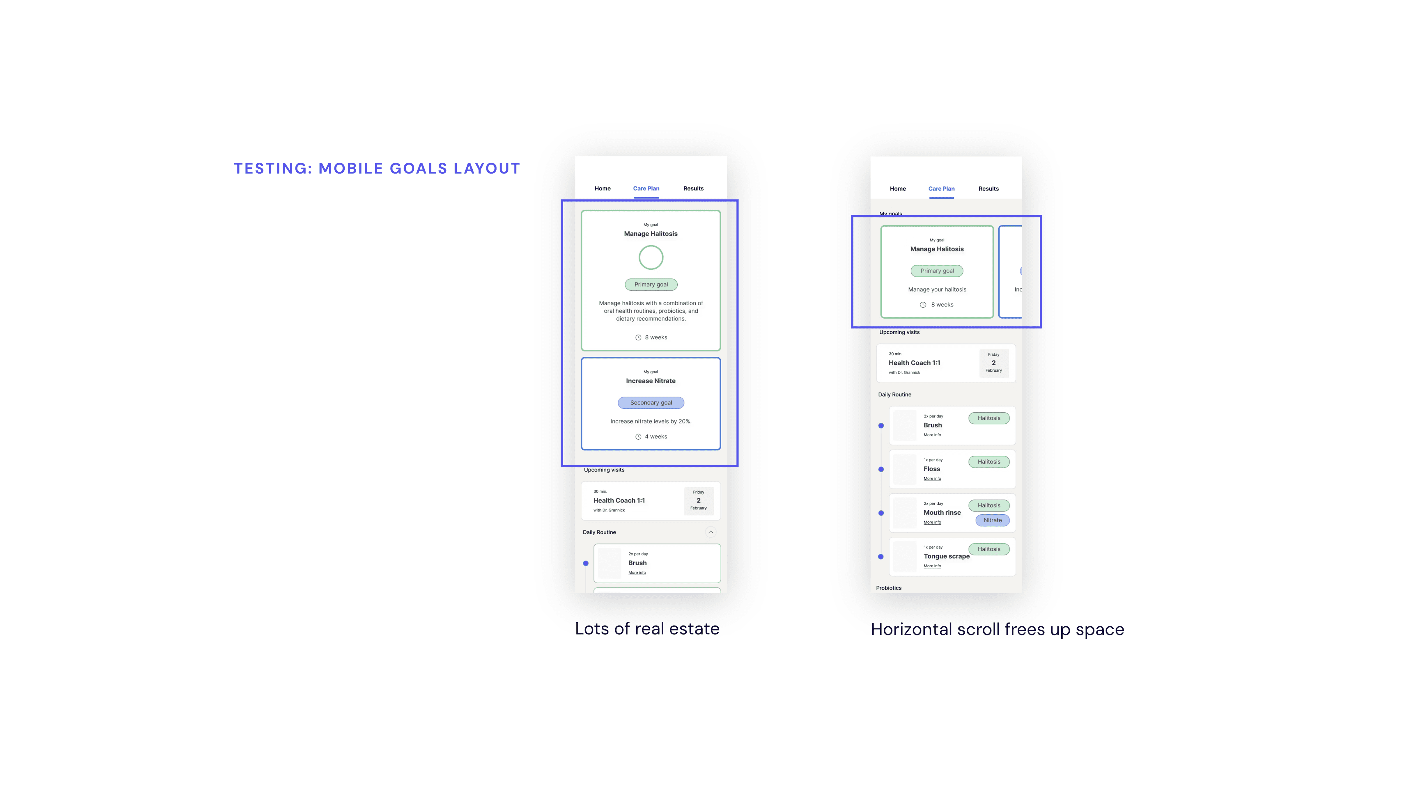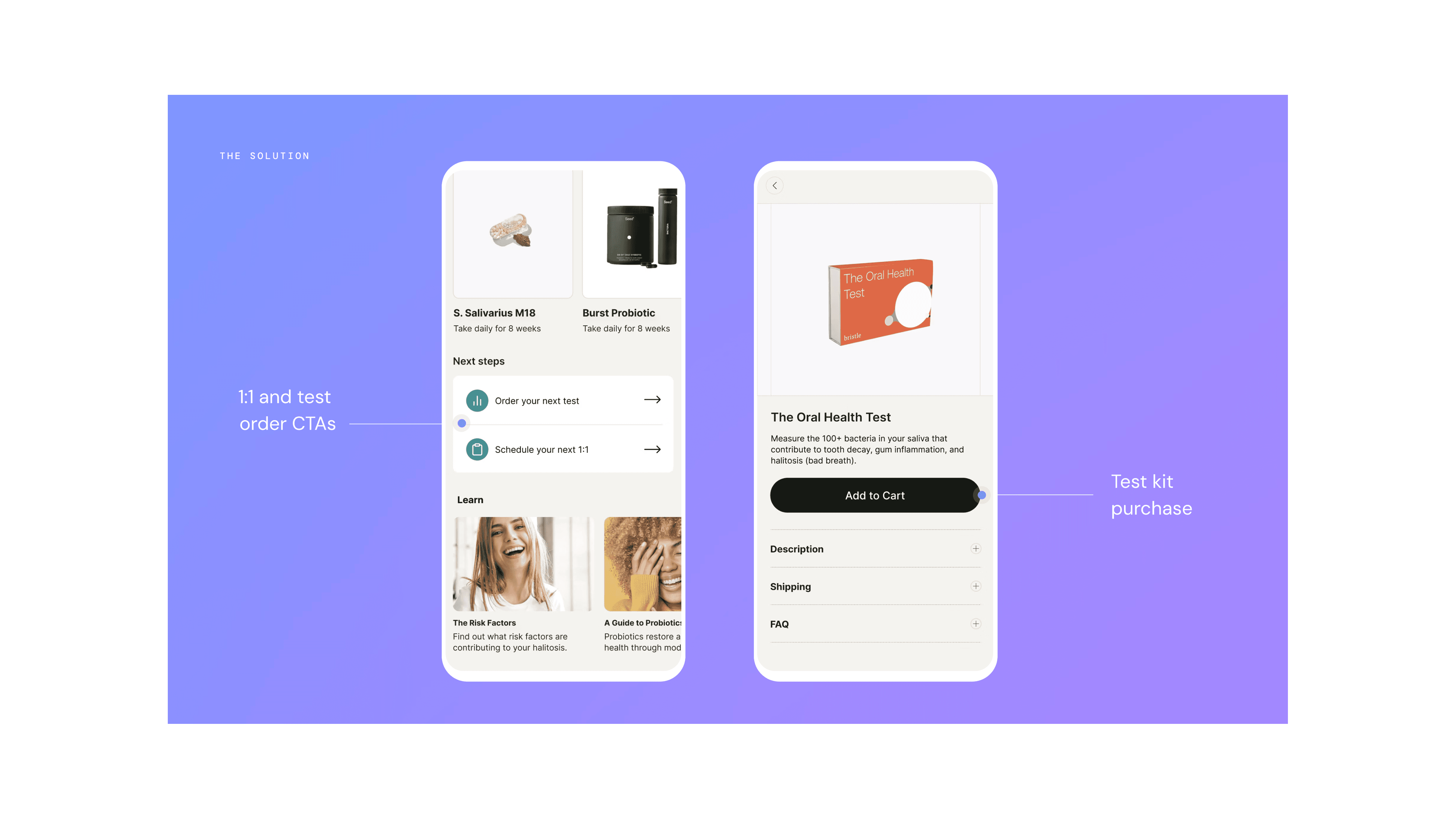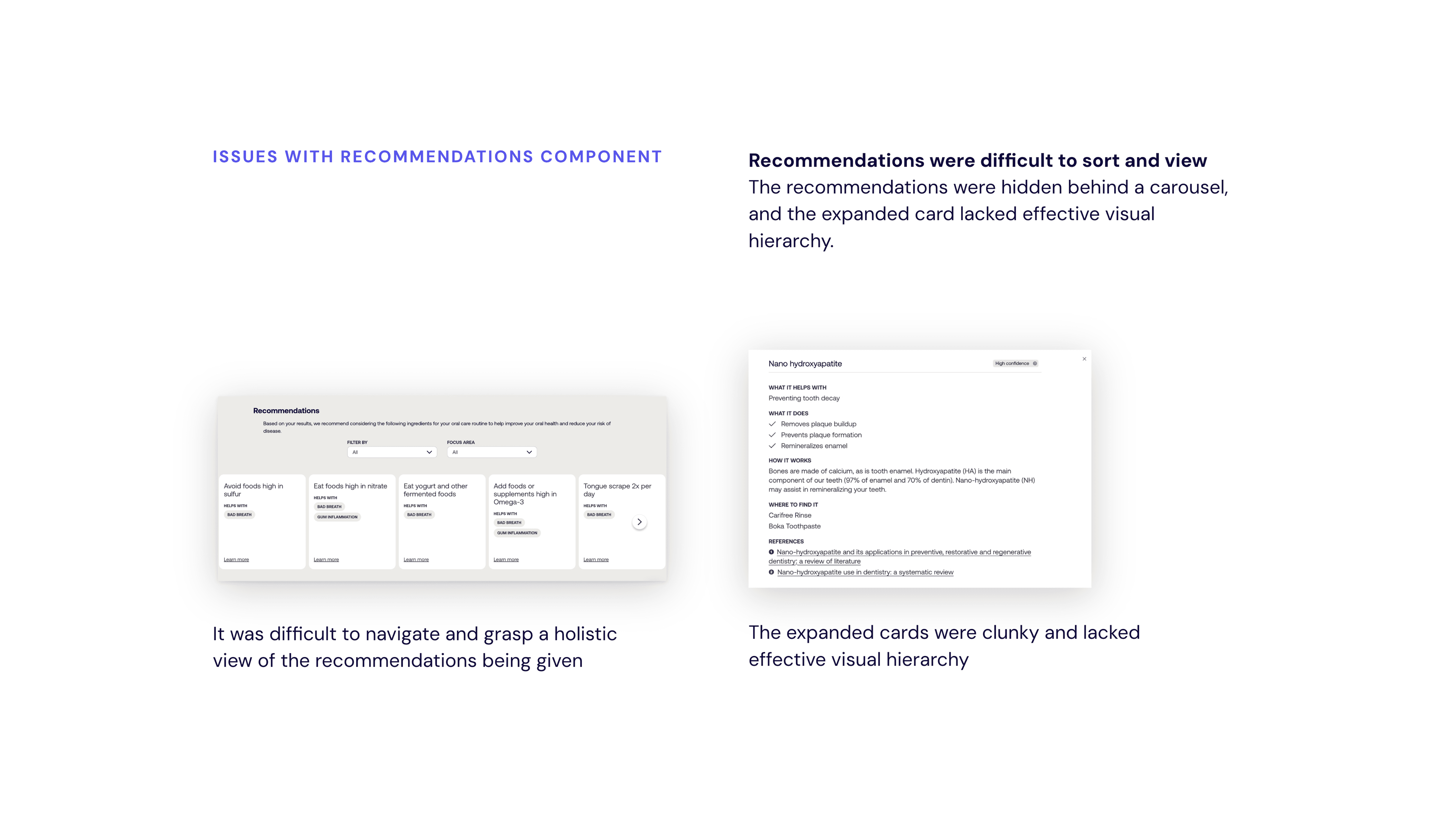 After completing an at-home saliva test, users receive their oral microbiome results alongside personalized recommendations designed to help them take action. The recommendations experience suffered from poor placement, weak visual hierarchy, and an inconsistent UI that failed to match the credibility of the underlying science. This undermined trust and reducing the likelihood that users would take action.
