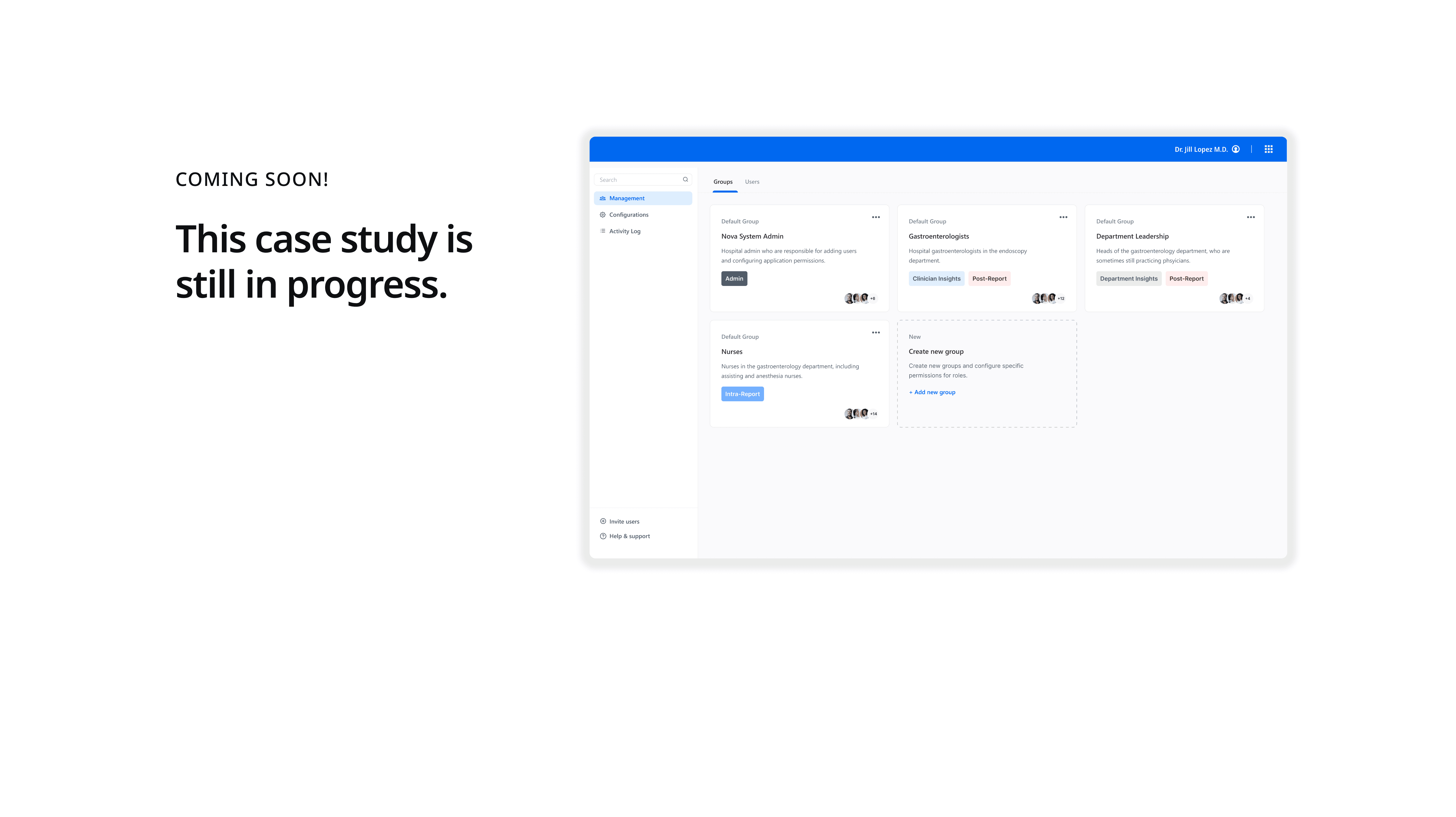 We designed a groups-based admin portal where IT admins can organize users by clinical role, assign app-specific permissions per group, and manage membership at scale — reducing configuration overhead and making access control legible to non-technical admins.