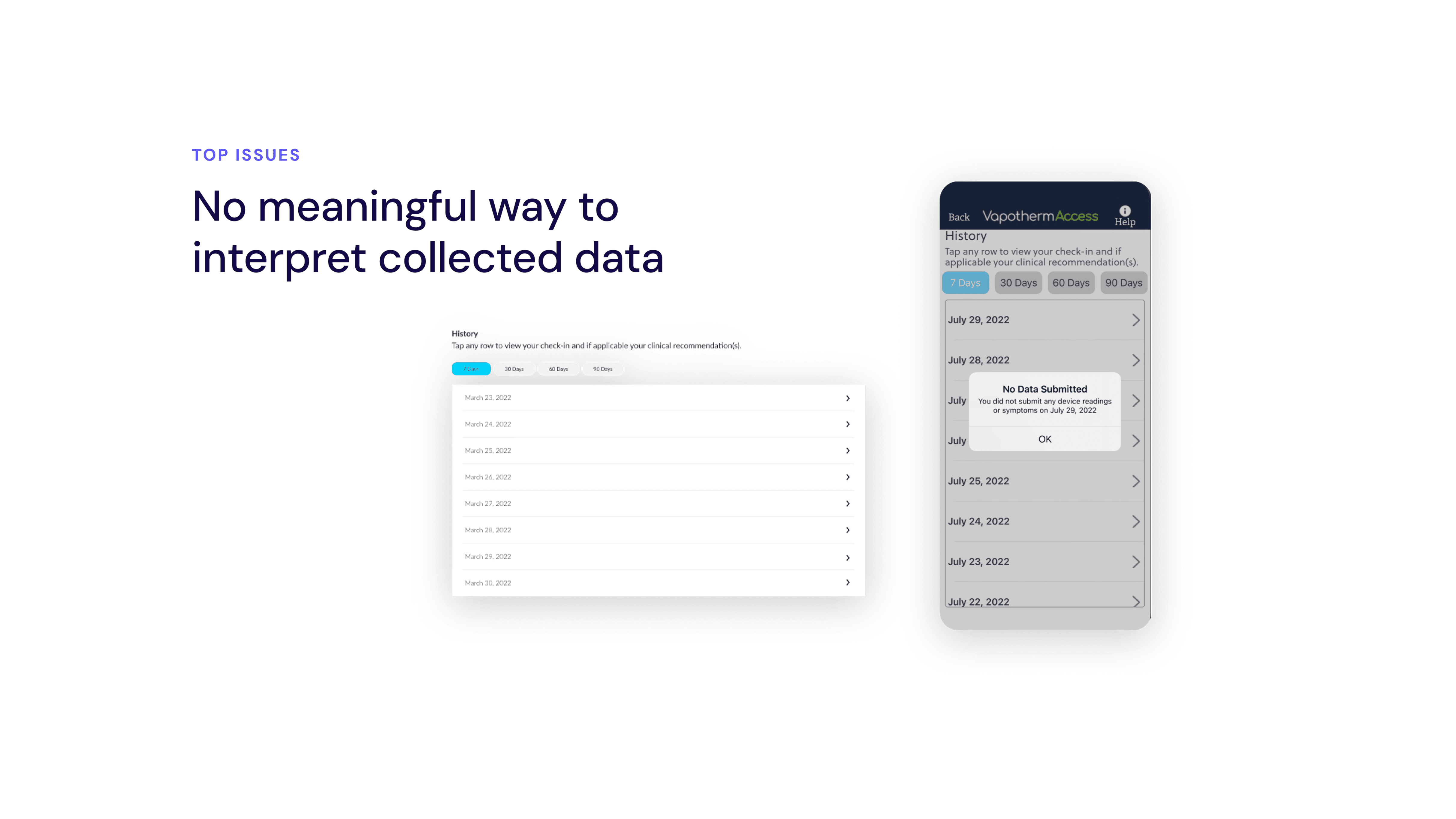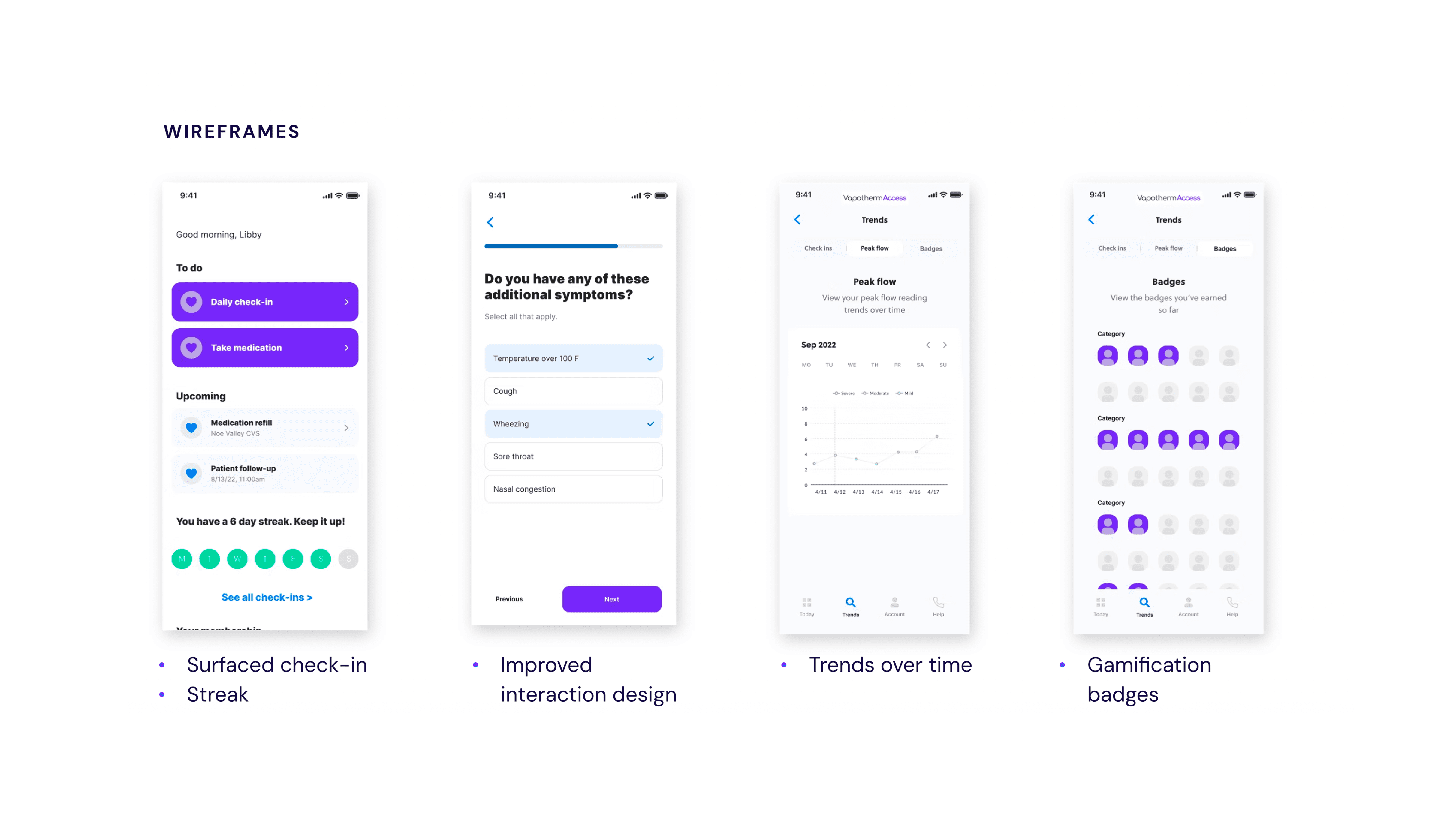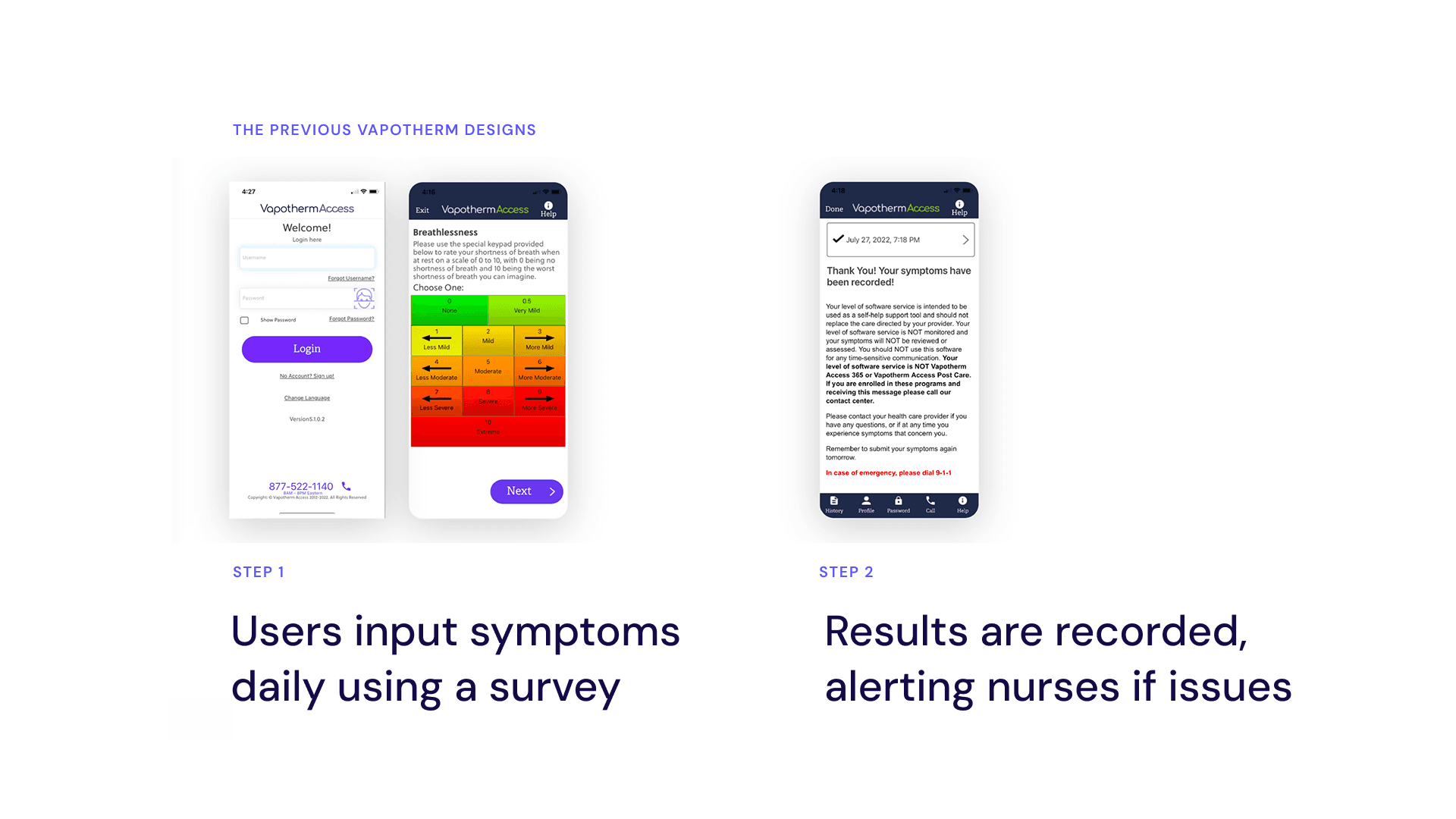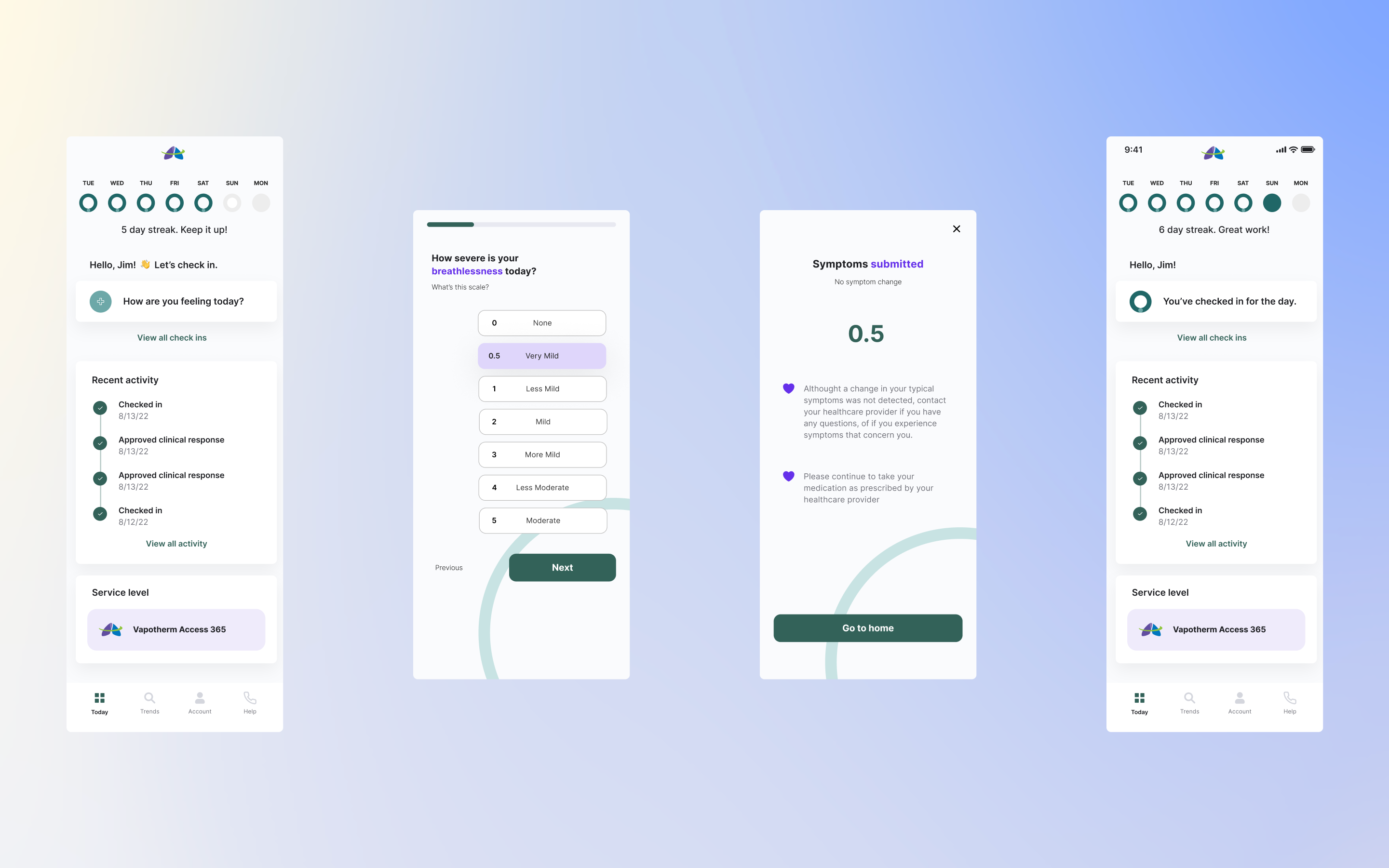 I redesigned Vapotherm’s symptom-tracking experience to prioritize clarity, consistency, and motivation. The new flow reduced cognitive and interaction load by simplifying daily check-ins, clearly communicating progress, and surfacing symptom trends in a way that felt understandable and relevant to patients.