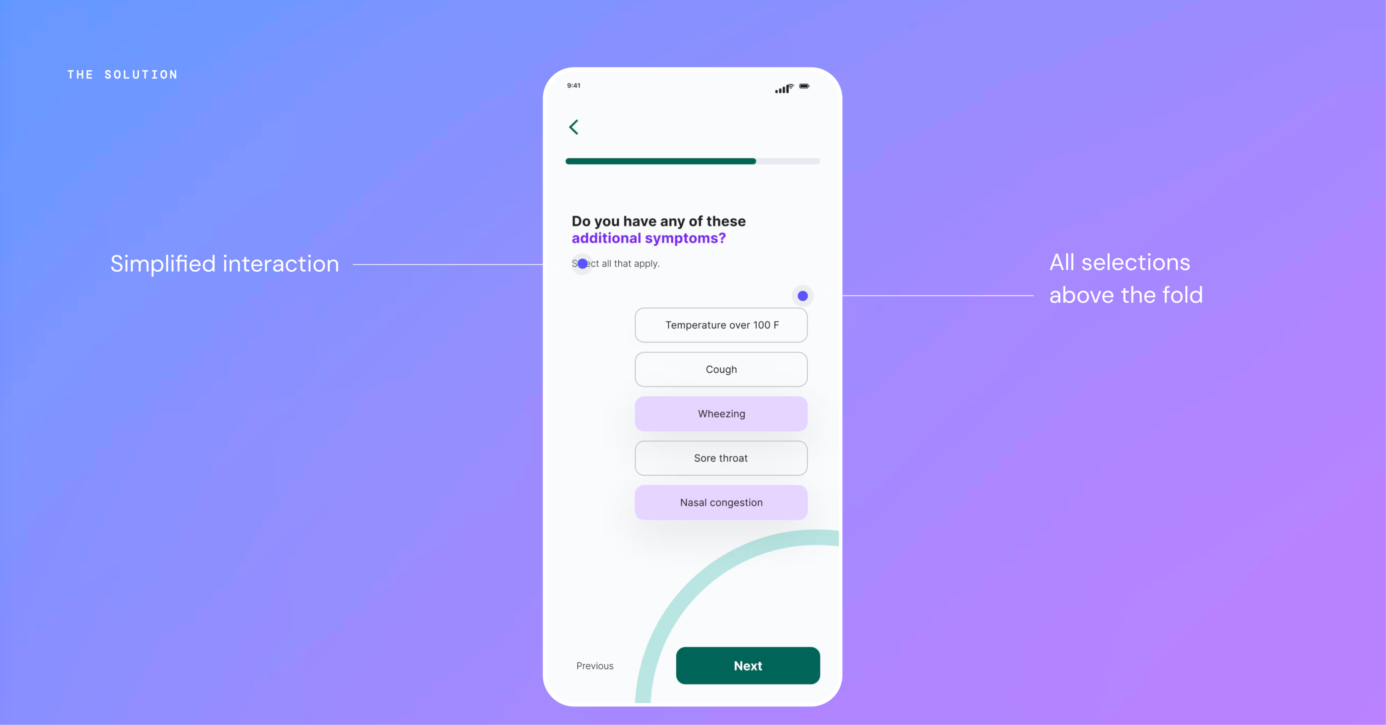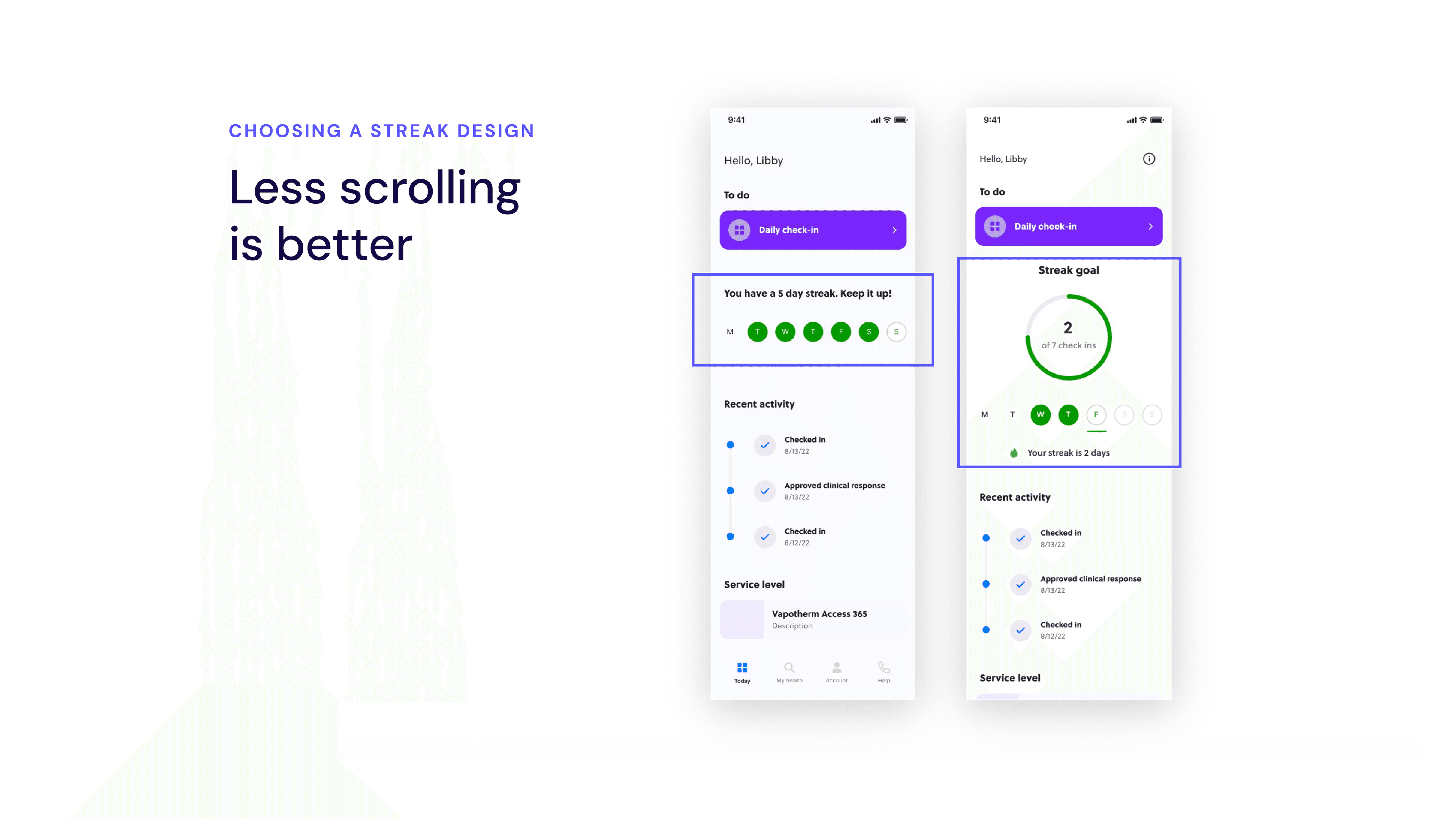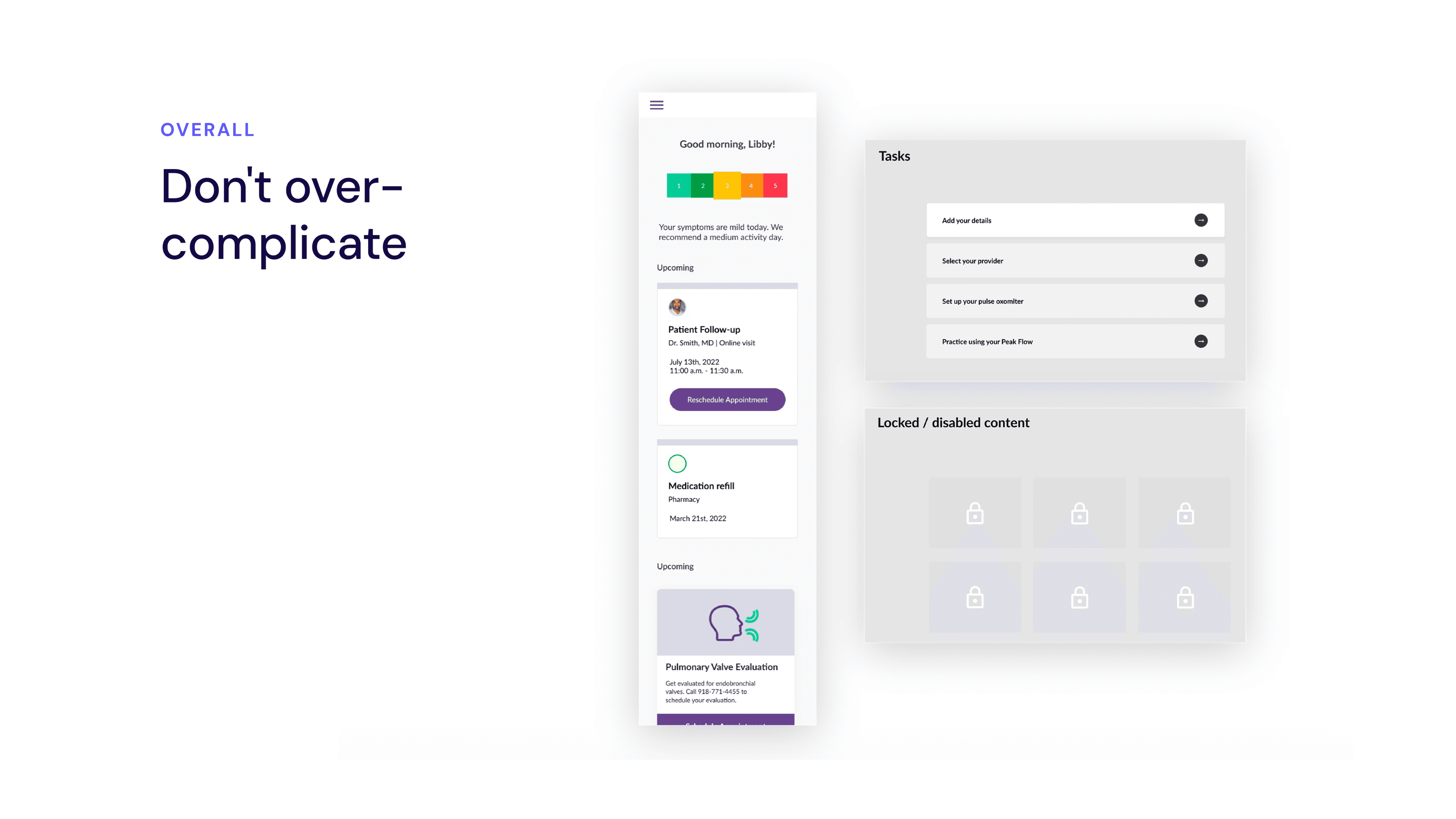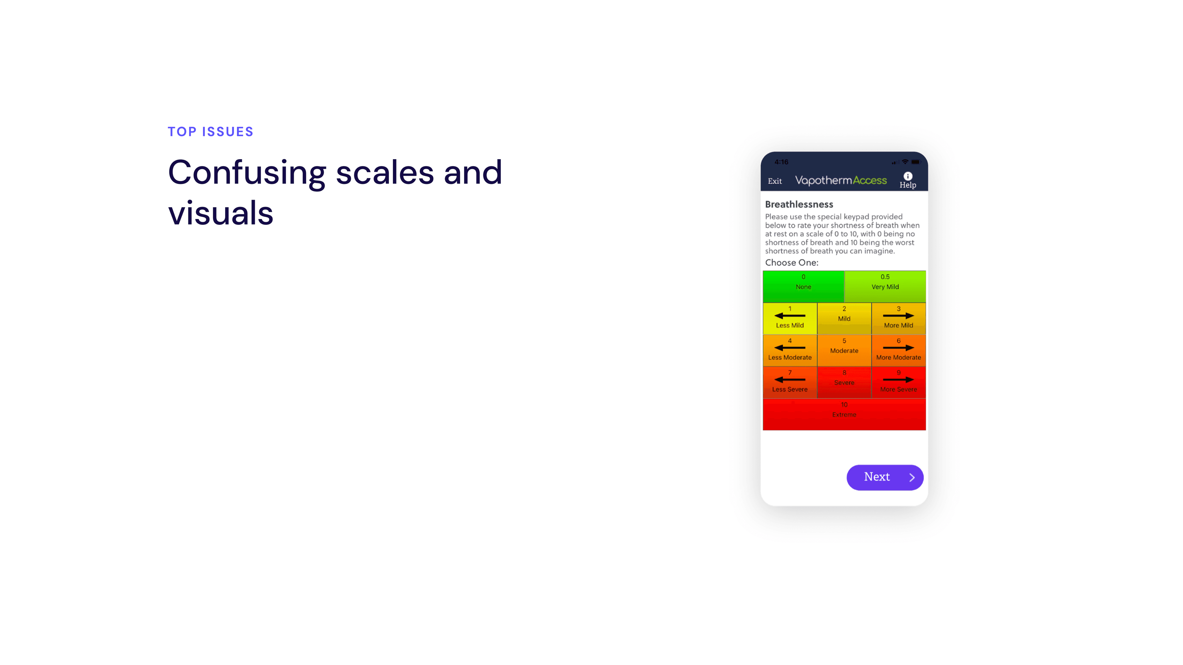 I redesigned Vapotherm’s symptom-tracking experience to prioritize clarity, consistency, and motivation. The new flow reduced cognitive and interaction load by simplifying daily check-ins, clearly communicating progress, and surfacing symptom trends in a way that felt understandable and relevant to patients.