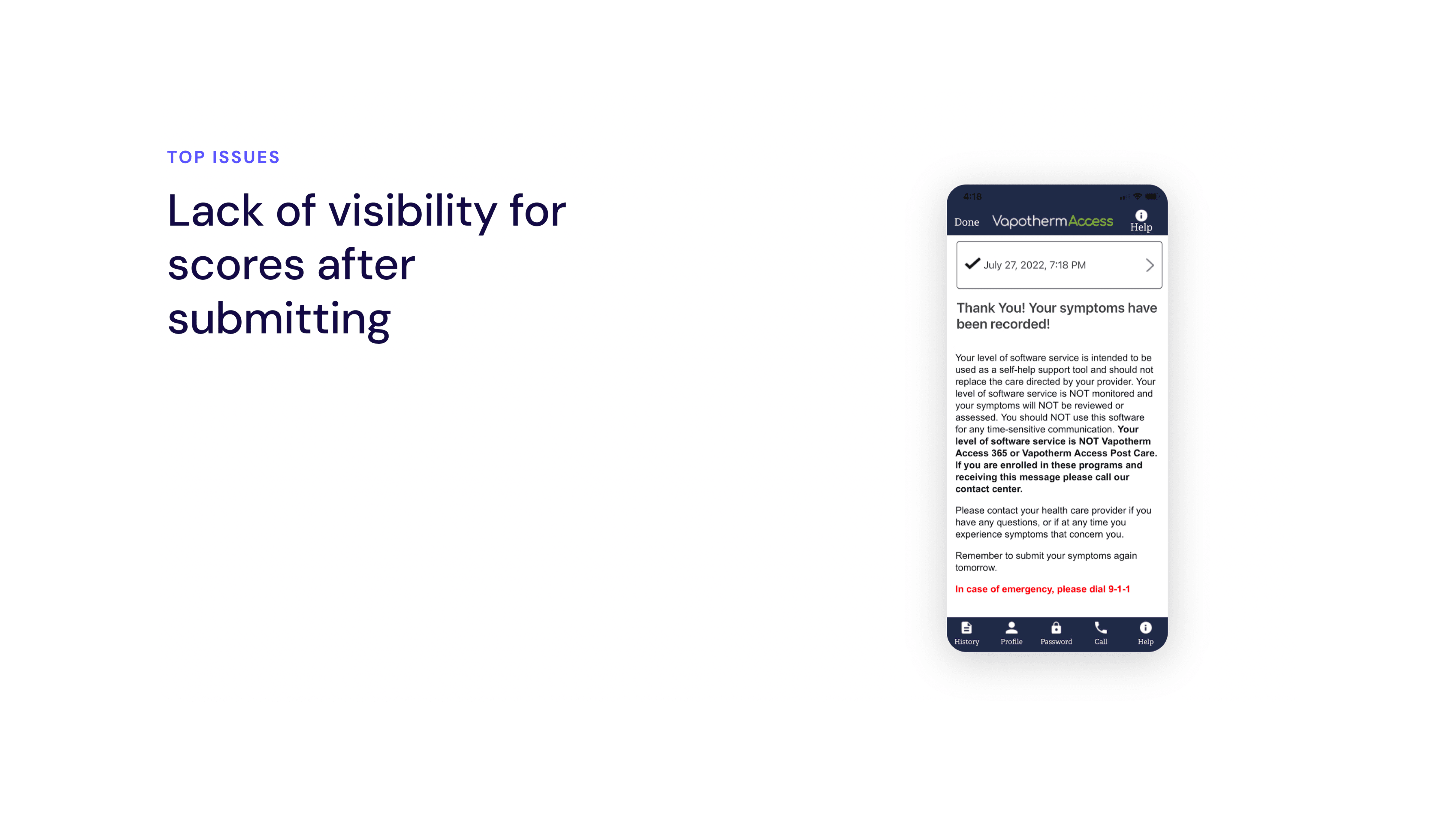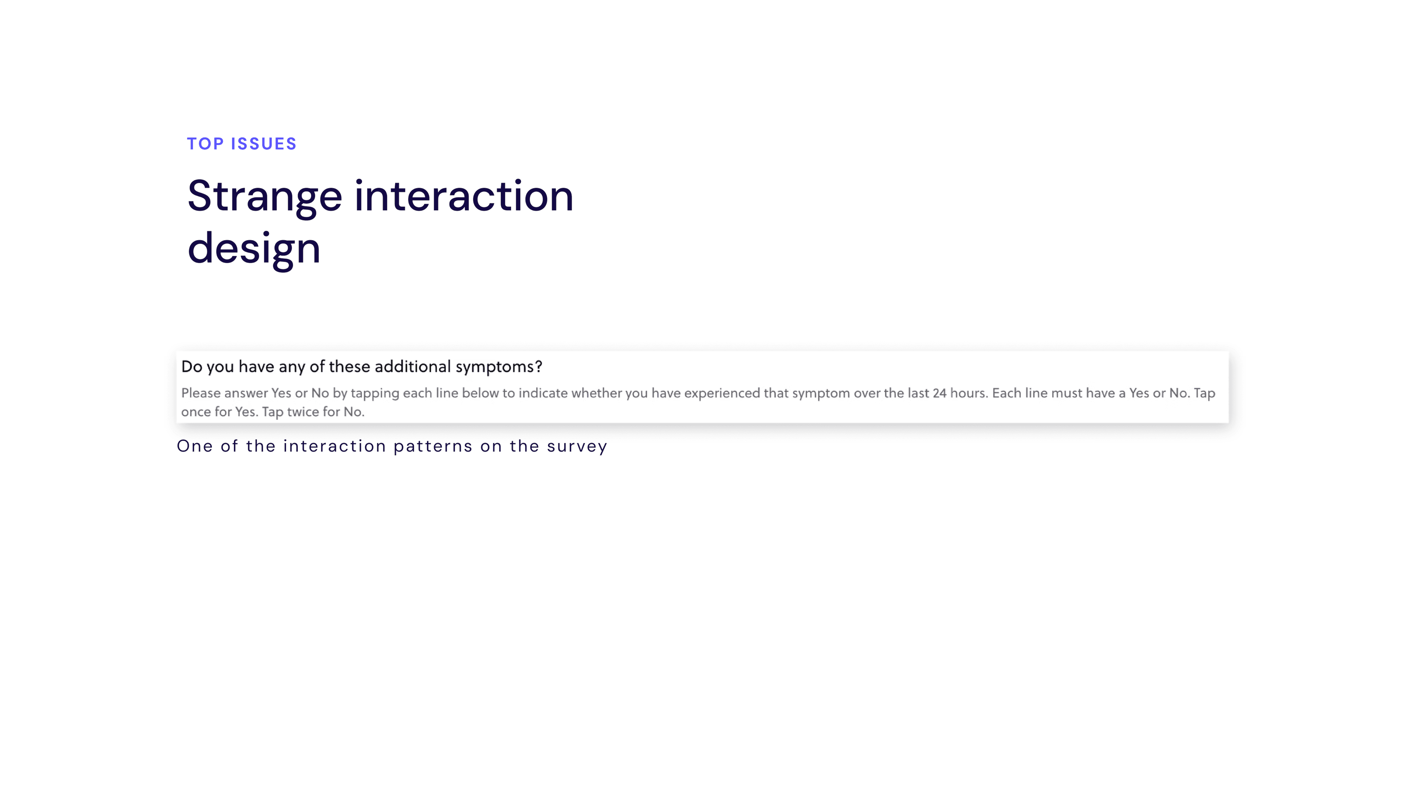 The existing app was a bare-bones ten-step questionnaire with no continuity — once patients submitted their responses, that data disappeared. With no visibility into their history, no sense of progress, and a confusing interface, there was little reason for patients to keep coming back.